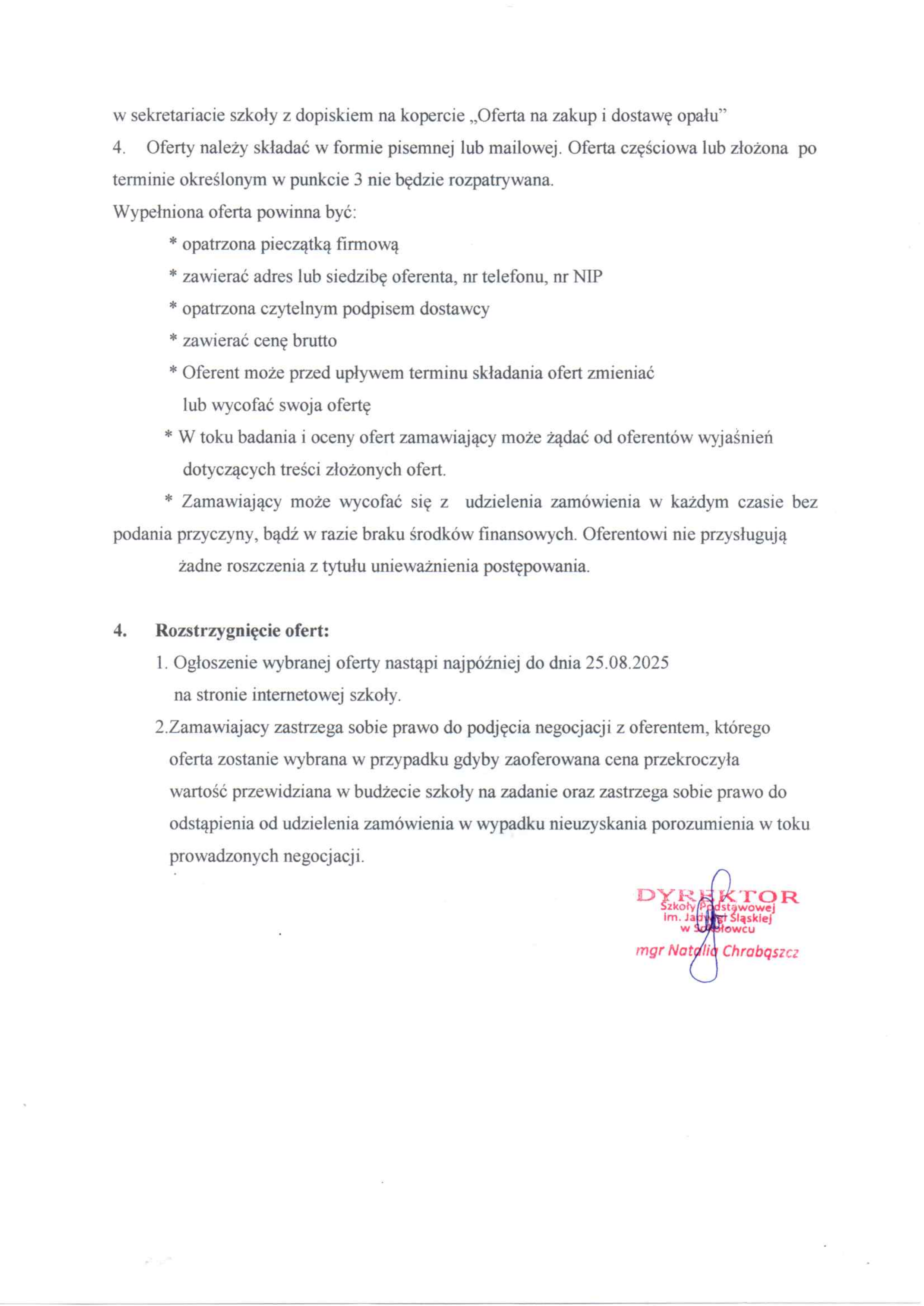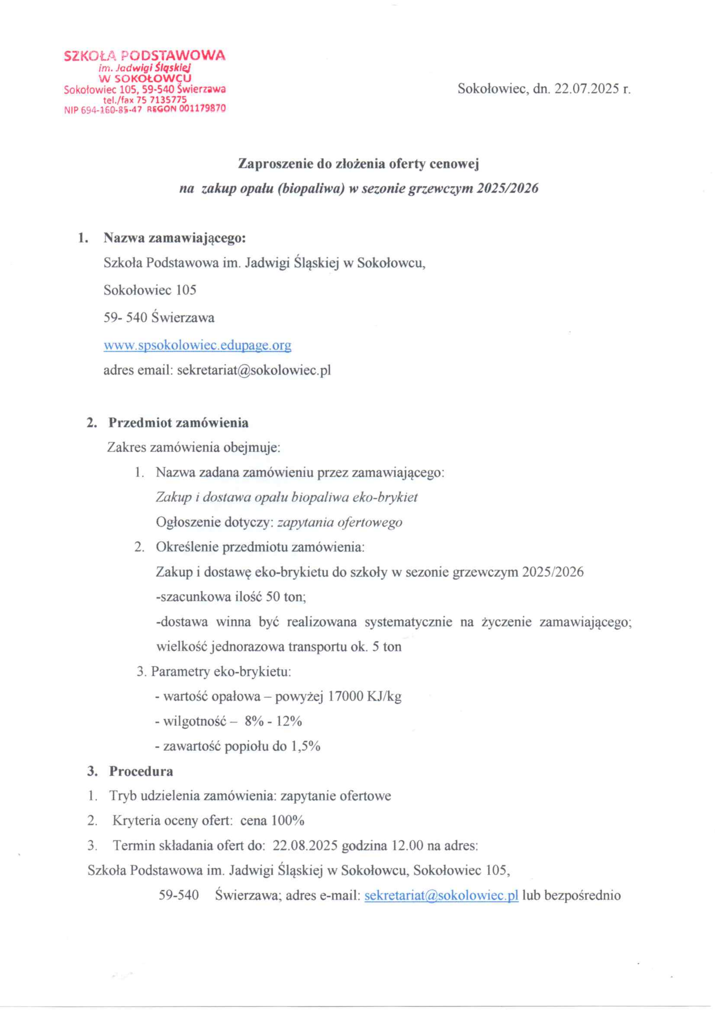 Zaproszenie do złożenia oferty cenowej na zakup opału w roku szkolnym 2025/2026